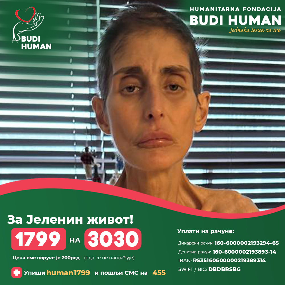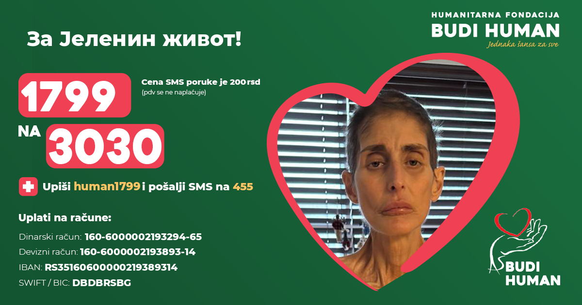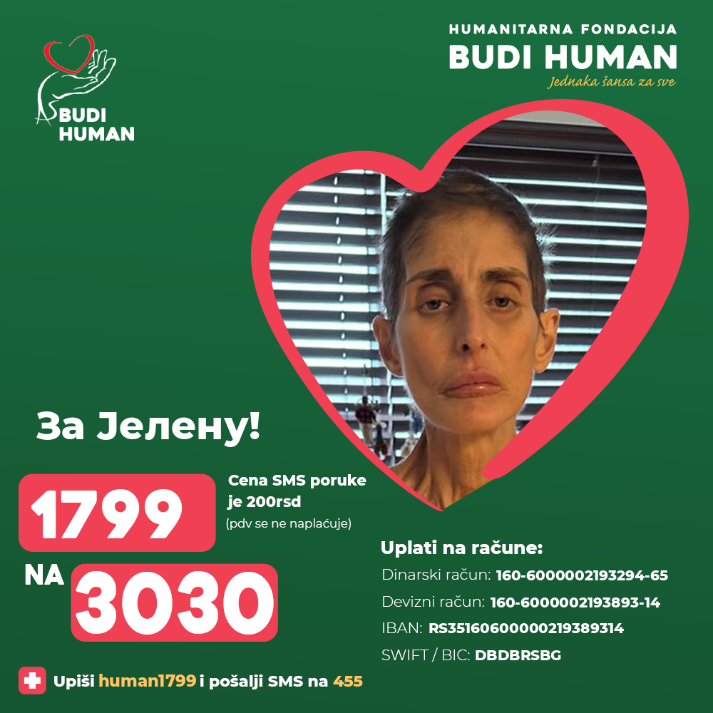 С обзиром да дијализу веома тешко подноси Јелени је хитно потребна трансплантација бубрега за коју је добила позитивно мишљење од једне болнице у Турској за шта су јој неопходна значајна финансијска средства која није у могућности самостално да обезбеди па се обраћа свим људима добре воље који су у могућности да помогну да што пре прикупи неопходна средства.