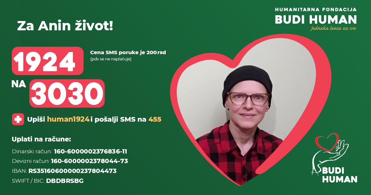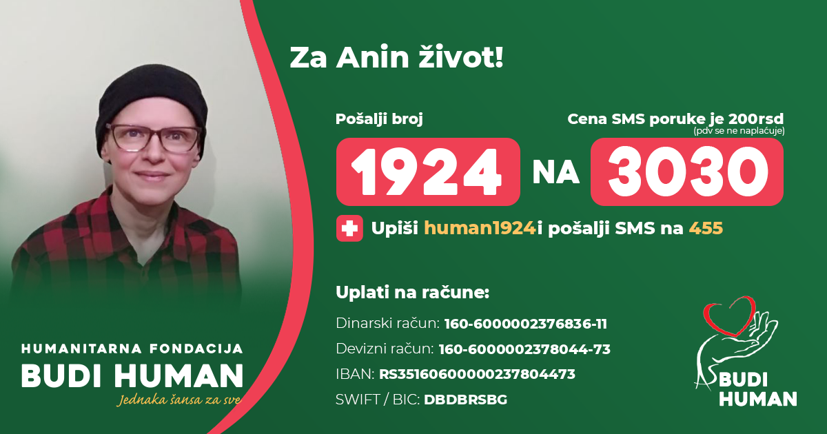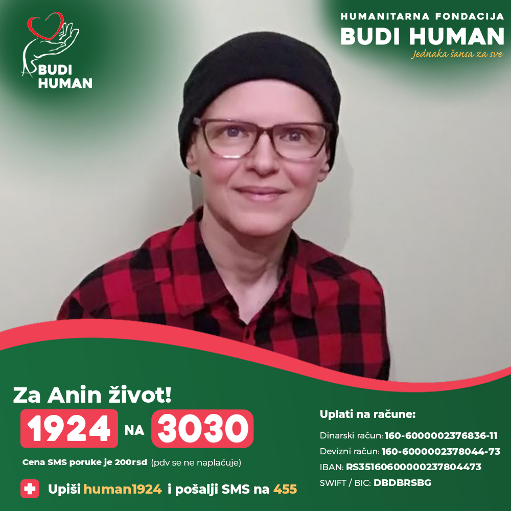 Веру у излечење Ана је пронашла на клиници у иностранству специјализованој за лечење онколошких болести иновативним терапијама. С обзиром да овај вид лечења изискује високе трошкове моле се сви људи добре воље да помогну донацијама.
