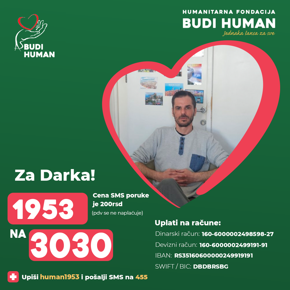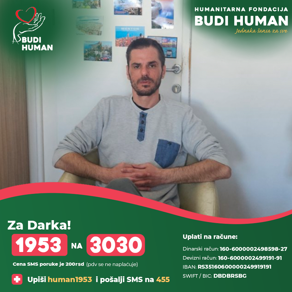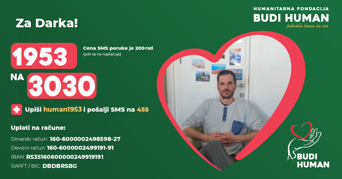 Наставак лечења у иностранству захтева значајна финансијска средства која Дарко није у стању да обезбеди због чега се обраћа свим хуманим људима да помогну својим донацијама како би оперативно лечење било обављено у најкраћем року.
