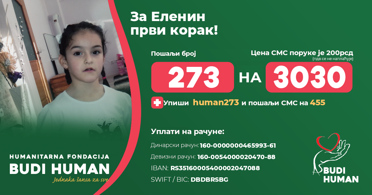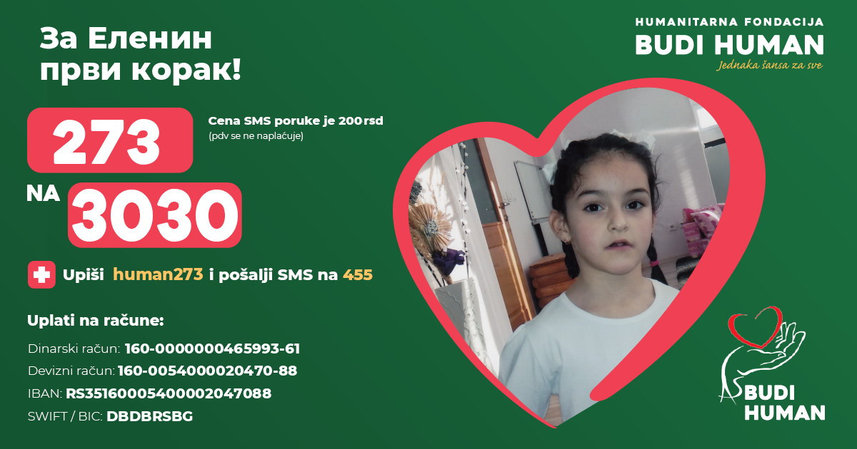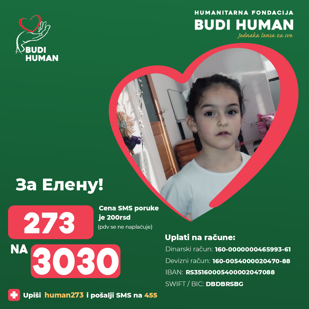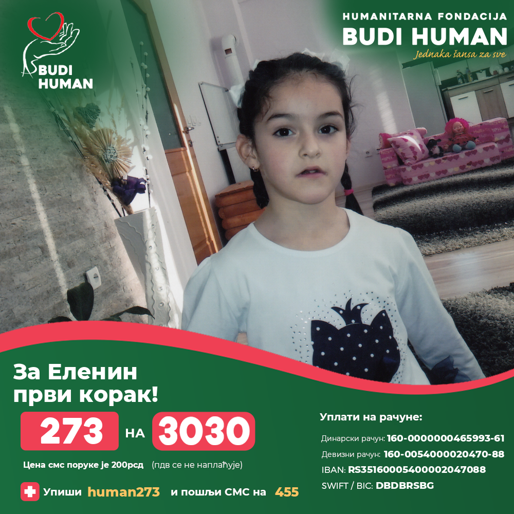 Елена не хода самостално, има невољне покрете руку, изговара неразумљиво најосновније речи, али упркос свему, редовна је у вртићу. Родитељи су годинама свакодневно радили са њом, водили је на вежбе, рехабилитације. И упркос њиховом озбиљном раду и труду, Елени је ипак неопходна операција истезања мишића код руских лекара како би могла слободно да хода.