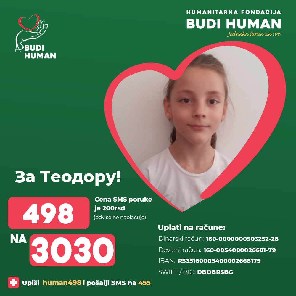 Породица се обраћа свим хуманим људима да им помогну како би што пре прикупили средства која су Теодори потребна да крене са лечењем.