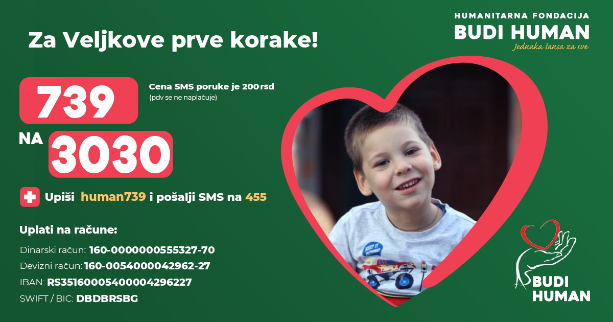 Породица се обраћа свим људима добре воље да помогну Вељков одлазак на даље физикалне терапије како би могао да начини свој први корак, да научи да хода, потрчи породици у загрљај, као и да има безбрижно детињство попут његових другара.
